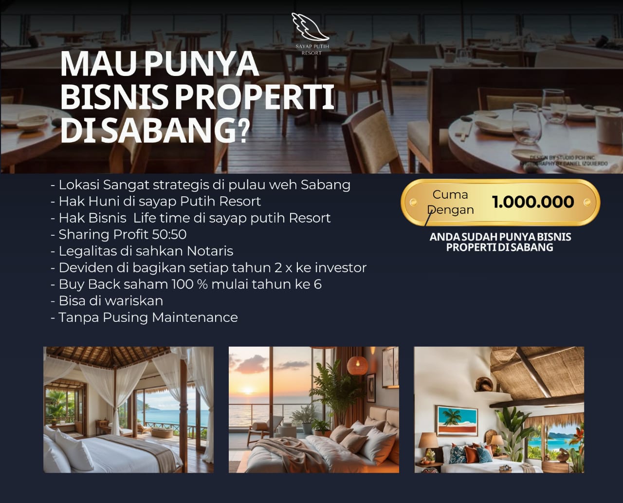PT SAYAP PUTIH MANDIRI (“SPM” atau “Penyelenggara“) hadir dalam mendukung pemerintah di bidang pariwisata, terutama di Pulau Weh Sabang, Aceh. Dengan mengembangkan bisnis Partnership ini mempertemukan kami sebagai penyelenggara dan investor sebagai pemodal. Dalam hal kerja sama ini, timbulnya hubungan perdata terjadi apabila pemodal sepakat untuk membeli saham keanggotaan partnership Sayap Putih Resort yang ditawarkan oleh penyelenggara PT SAYAP PUTIH MANDIRI. Sehingga segala risiko yang timbul dari hubungan tersebut akan menjadi tanggung jawab masing-masing pihak.